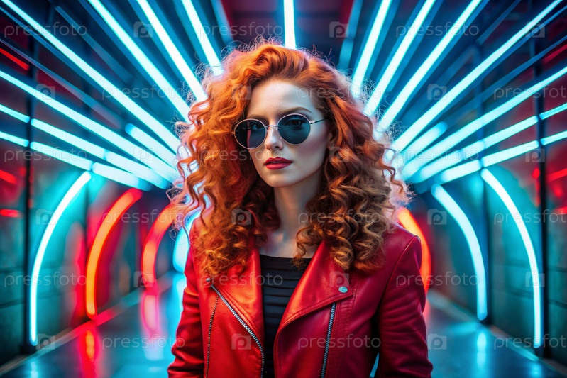 Молодая стильная красивая девушка в солнцезащитных очках стоит в неонном туннеле среди неоновых вывесок