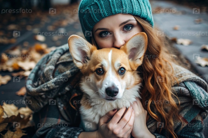Женщина обнимает валлийскую собаку Корги в осеннем парке.Сознательная жизнь с домашним животным, концепция дружбы и любви к животным