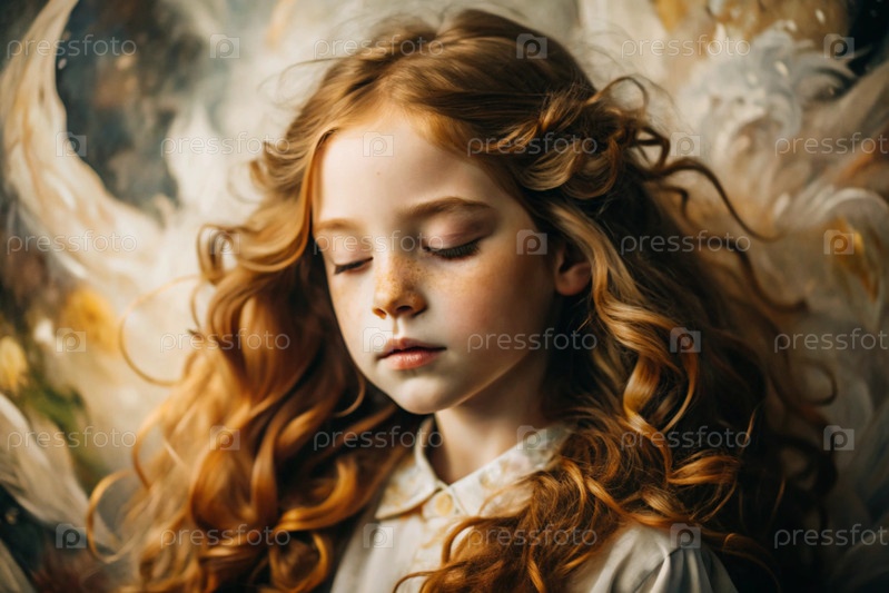 Портрет красивой маленькой рыжеволосой девочки с длинными волнистыми волосами и задумчивым взглядом.Власы развиваются и создают ощущение легкости и естественности