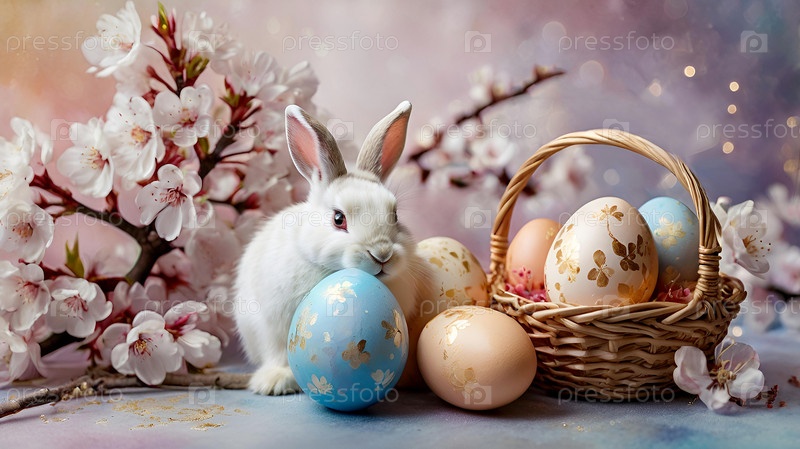 Нежные пасхальные яйца, белый кролик и вишневые ветви на фоне пастельного акварели с нежными полосками