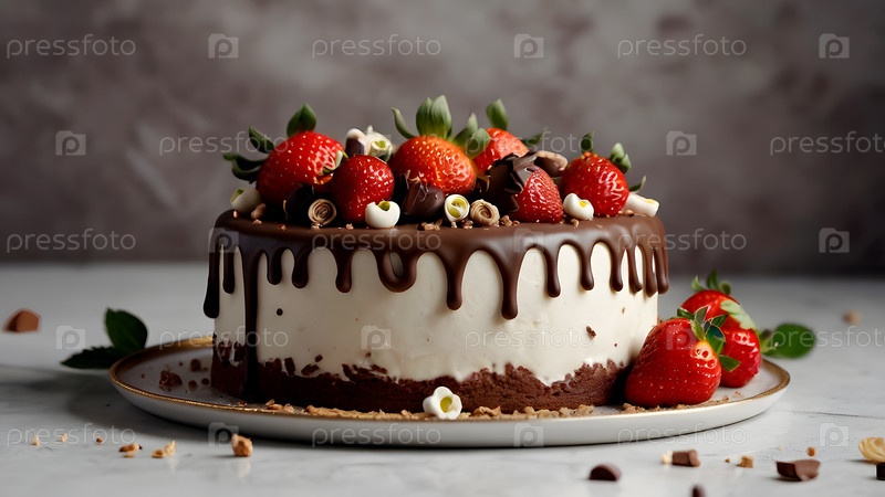 Концепция праздничных блюд. Пекарня. Красивый вкусный торт со свежими клубниками и шоколадом на столе. День рождения и сладости