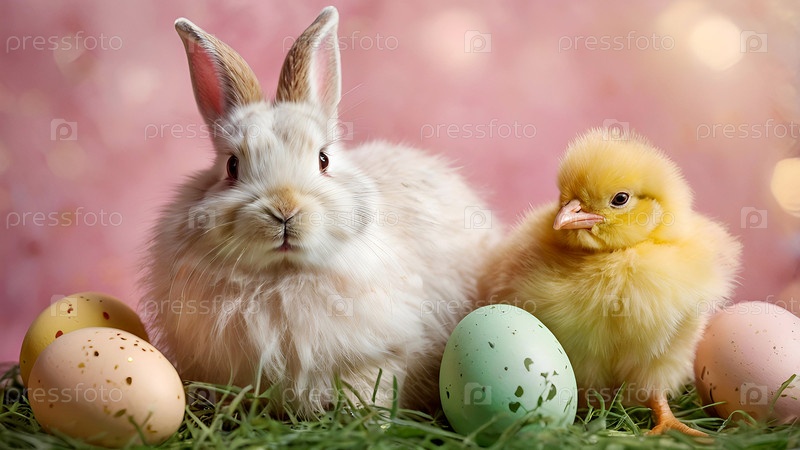 Концепция яркого пасхального праздника: нежные пасхальные яйца, кролики и куры на пастельном фоне