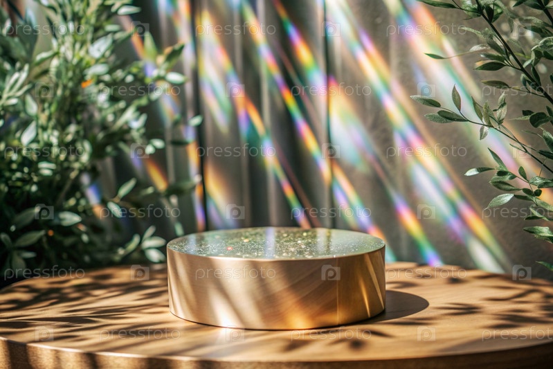 Пустой цилиндрический подиум со сверкающими кристаллами при преломлении света на минималистическом фоне, стенд для демонстрации моделей косметики и товаров