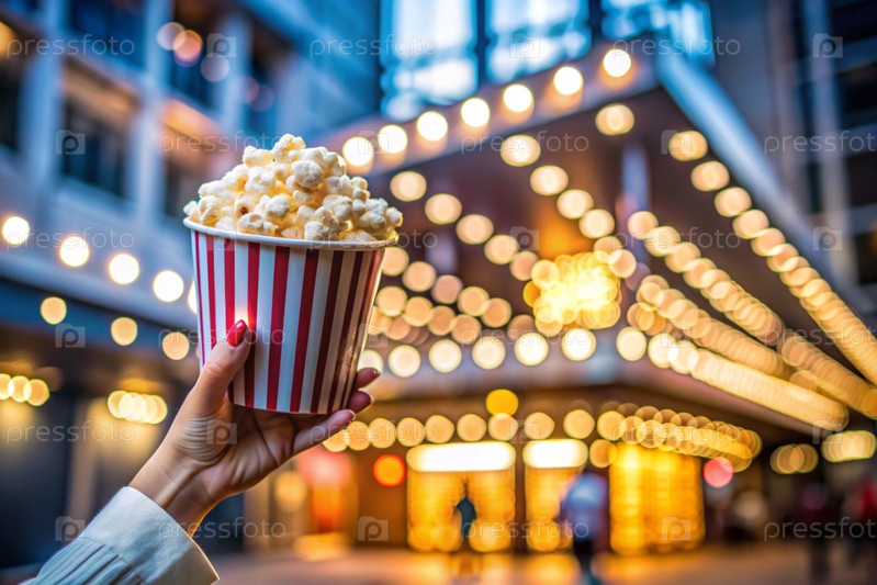 Красно-белый полосатый ящик с солеными попкорнами в руке на фоне светофоров кинотеатра