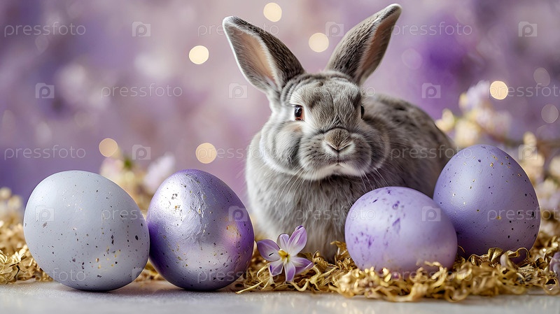 Нежные пасхальные яйца, серый кролик и фиолетовые цветы гиацинта на пастельном акварельном фоне с нежными венами