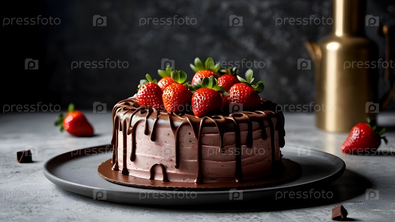 Концепция праздничных блюд. Пекарня. Красивый вкусный торт со свежими клубниками и шоколадом на столе. День рождения и сладости
