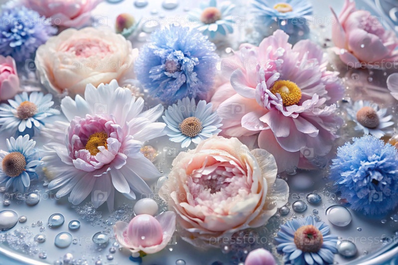 Красивый, воздушный, деликатный цветочный фон в синих и розовых тонах. цветы пиона, хризантемы, ромашки с каплями воды на лепестках