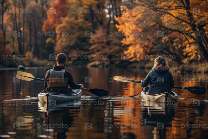 Каякисты с веслами в руках плывут по реке на фоне осеннего пейзажа