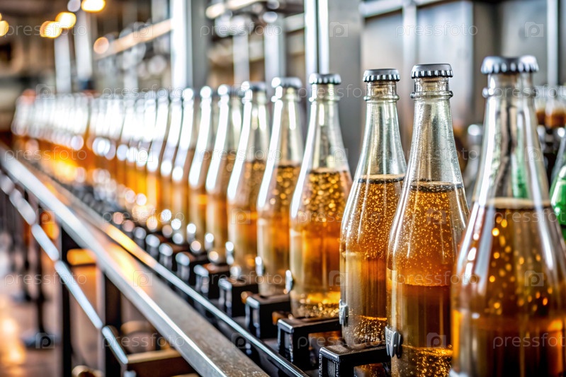 Пищевая промышленность. конвейер. линия розлива соды в стеклянных бутылках на заводе. вид на бутылку сладкого напитка с газом
