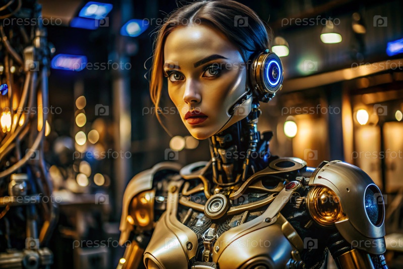 Женский робот-киборг. Интеграция технологий и человеческого взаимодействия. Производство роботов. Искусственный интеллект, Интернет и цифровые технологии будущего