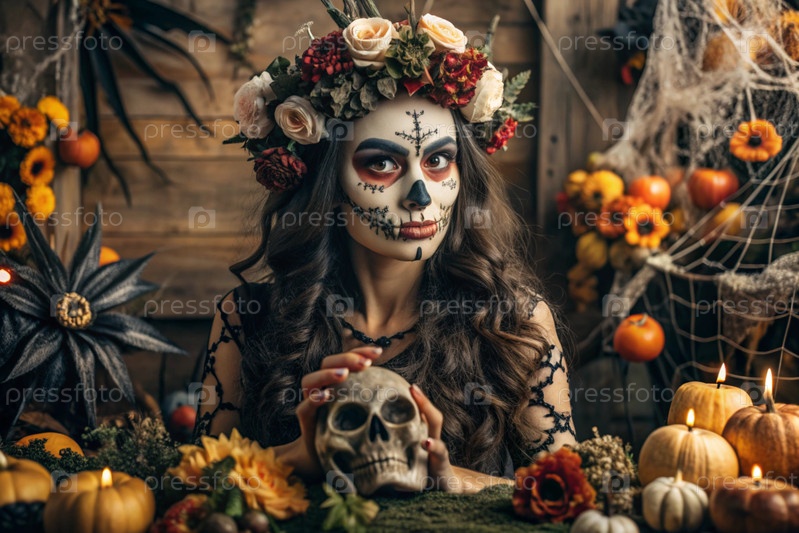 Концепция Хэллоуина. Ужасно. Костюмированная вечеринка. Красивая женщина с покрашенным черепом на лице и цветами на голове. Баннер, открытка