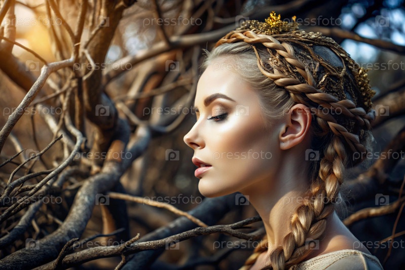 Творческий баннер для салона красоты в черно-золотом цвете. Красивая женщина, окруженная лесом с макияжем и волосами. Золотые ветви дерева в волосах. Индустрия красоты