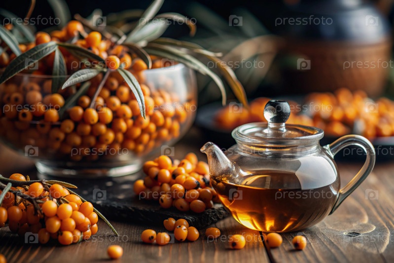 Здоровая, спелая ягода морского гречневого терна в ближайшем плане.Витамин, оранжевый, осенний, сезонный чай из ягод морского гречневого терна на темном фоне.Яблочный чай для иммунной системы