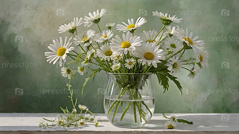 Легкий, воздушный букет маргариток в стеклянной вазе на пастельном фоне. Близко. Понятие семьи, любви и верности