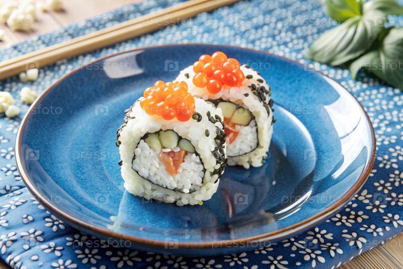 Японская еда. Суши-роллы Калифорния, Филадельфия с угорьем, красной икры и лососем. Концепция меню суши-бара