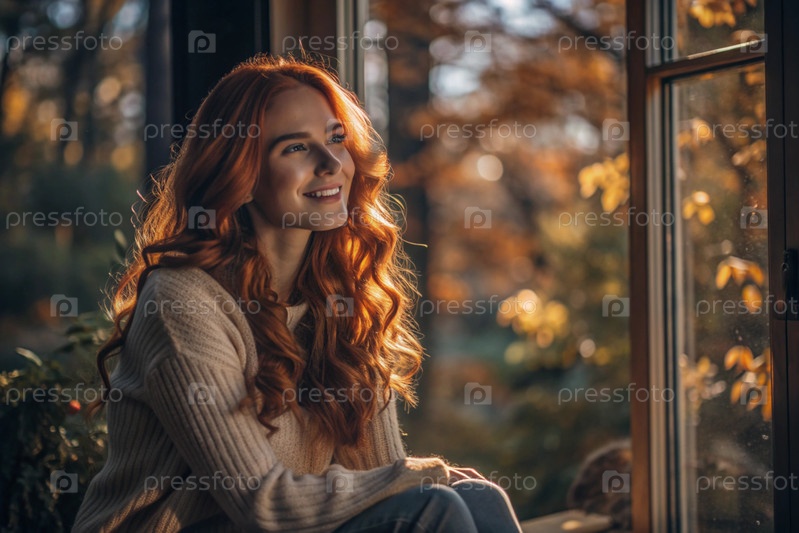 Портрет красивой улыбающейся рыжеволосой девушки с кудрявыми волосами у окна, где светит теплое осеннее солнце