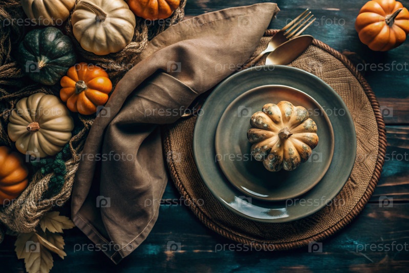 Красивый осенний стол. Тарелка из хлопкового салфетки и тыквенников. Старый обеденный стол на деревянном фоне. Концепция праздничной службы в День Благодарения