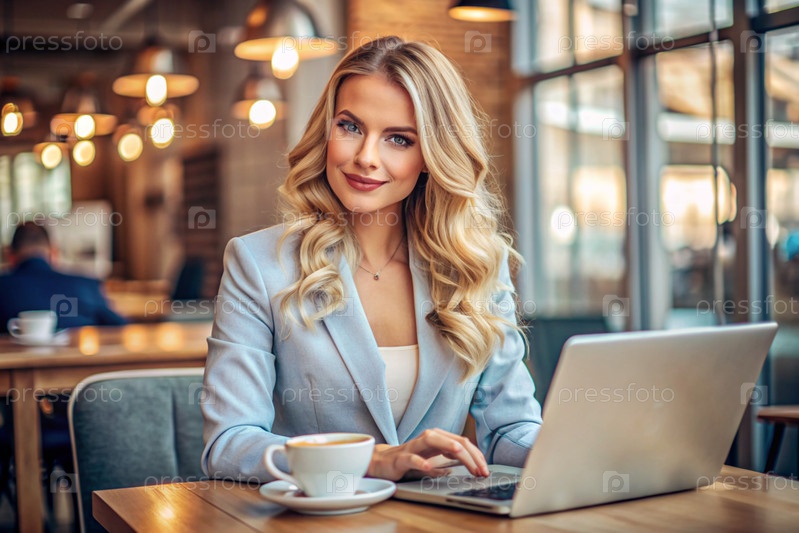 Молодая бизнес-женщина работает на ноутбуке в кафе или делает покупки онлайн