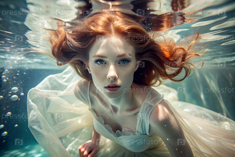 Портрет красивой рыжеволосой девушки в модном белом платье под водой на глубине