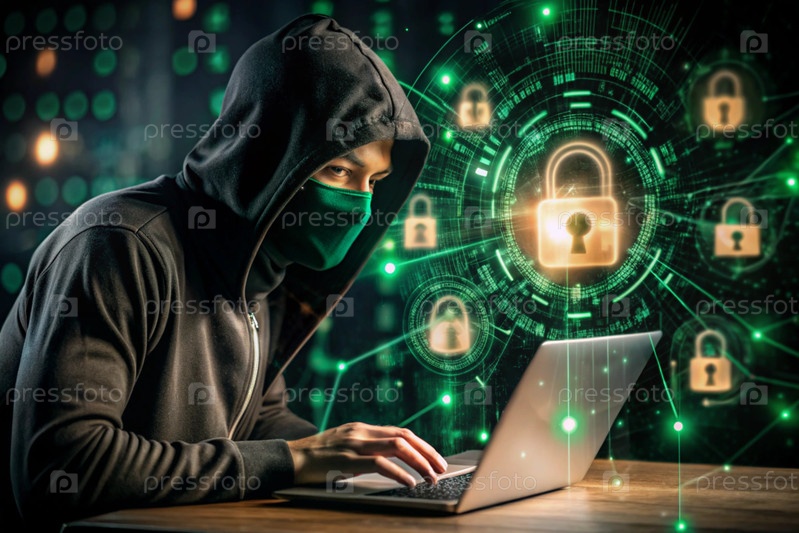 Хакер работает на ноутбуке, цифровые коды на виртуальном фоне. взлом и защита онлайн-данных. цифровые технологии, разработка программного обеспечения