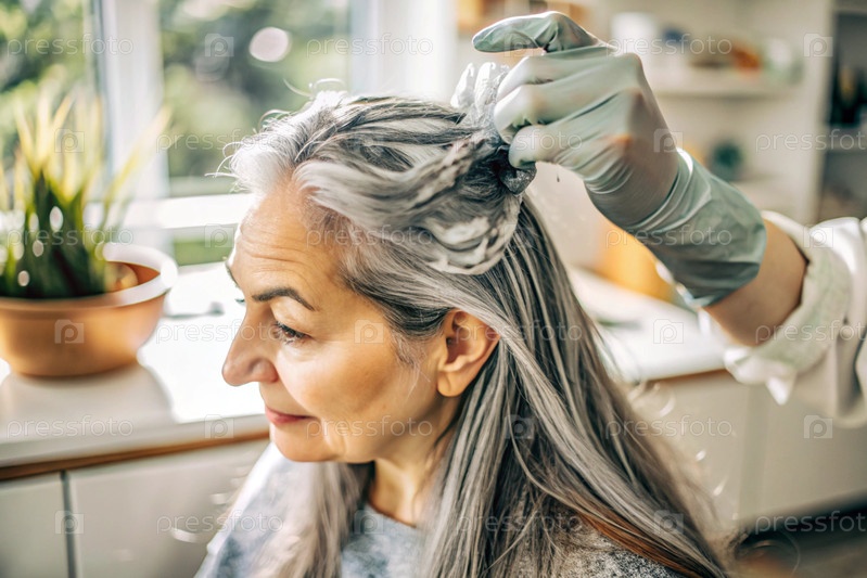 Женщина средних лет красит дома седые волосы.Женщина сидит во внутренней части комнаты.Дочь рисует маму