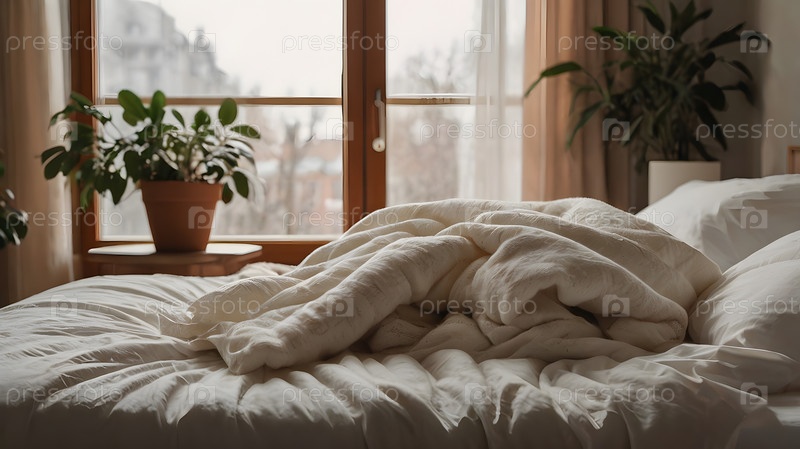Интерьер современного дома.Минималистский уютный бежевый интерьер спальни с клеткой, подушками, головной доской, полотном и ночным столом