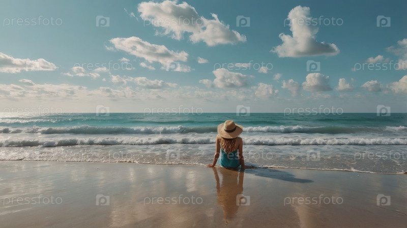 Женщина на отдыхе, сидящая в купальнике и соломенной шляпе с широкими краями на пляже в солнечный день и смотрящая на море