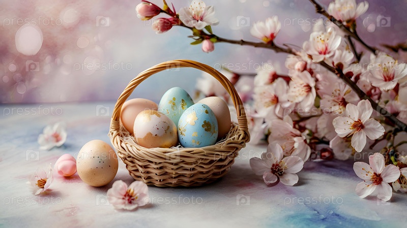 Нежные пасхальные яйца и вишневые ветви цветут на пастельном акварельном фоне с нежными полосками