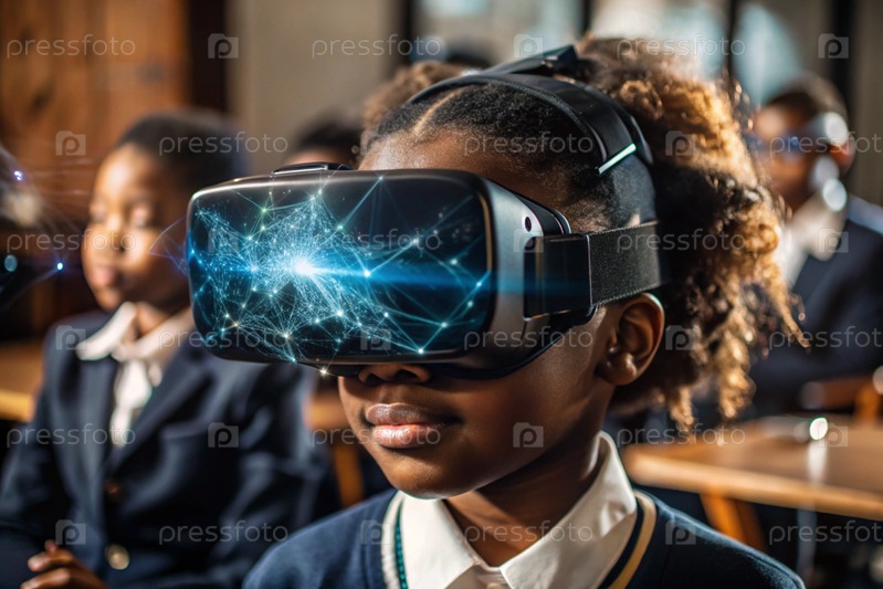 Чернокожая африканская девушка с очками виртуальной реальности.Ребенок находится в классе, а другие ученики на заднем плане.Цифровой интерфейс отображается в наушниках