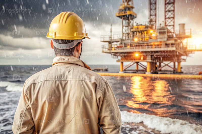 Добыча нефти. Нефтяные скважины и человек в рабочей одежде и строительном шлеме. Нефтяная платформа и промышленное оборудование. Тяжелые условия труда