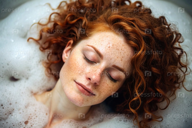 Близкий план красивой рыжеволосой женщины с веснушками и кудрявыми волосами, без макияжа. Она принимает баню из пузырьков. На заднем плане интерьер ванной комнаты в стиле лофт