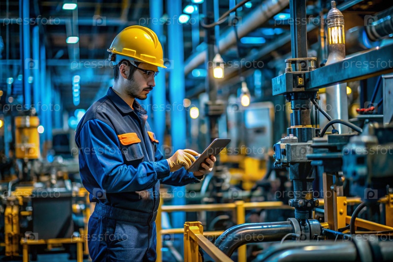 Профессиональный инженер, рабочий, техник в шлеме проверяет и работает на машине на заводе по производству запчастей