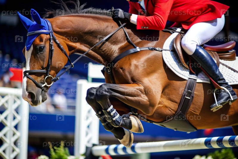 Близкий план олимпийской лошади и всадника, перепрыгивающих через препятствие на открытой арене - это конная езда