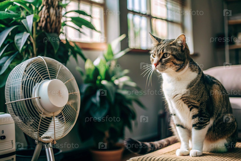 В очень жаркий летний день усталый кот находится в гостиной перед фанатами