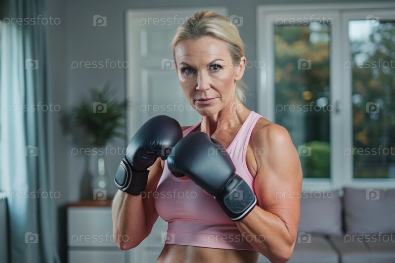 Портрет зрелой женщины: атлетичная, активная женщина средних лет в спортивной одежде и боксерских перчатках стоит на стенде и готовится к боксу дома