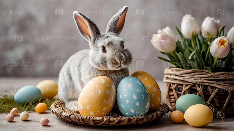Концепция яркого пасхального праздника: нежные пасхальные яйца и пасхальный кролик