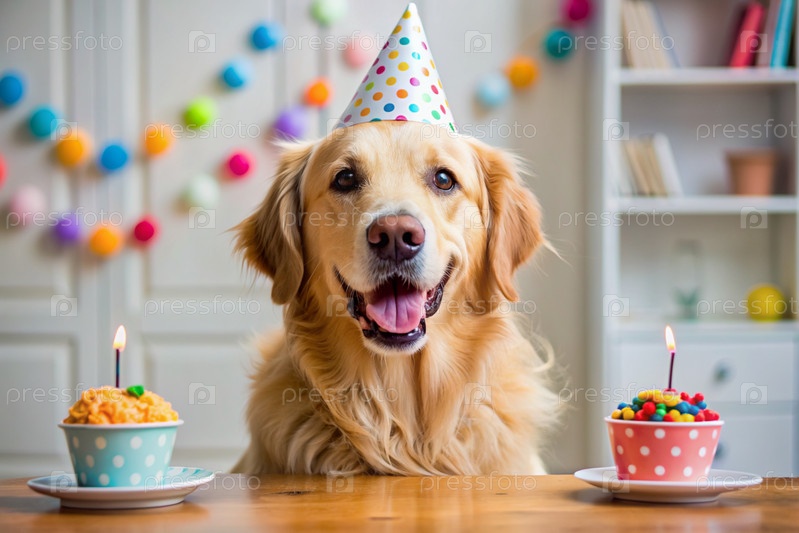 Собака сидит с тортом, воздушными шарами и флагами на вечеринке по случаю дня рождения