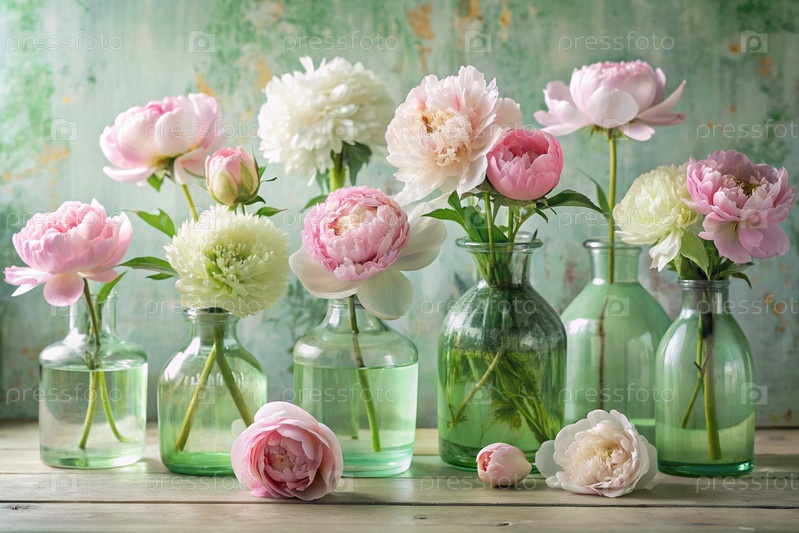 Красивые белые и розовые пионы в стеклянных вазах на деревянном столе. Цветы и почки в вазе. Светлый, белый, розово-зеленый цветочный фон