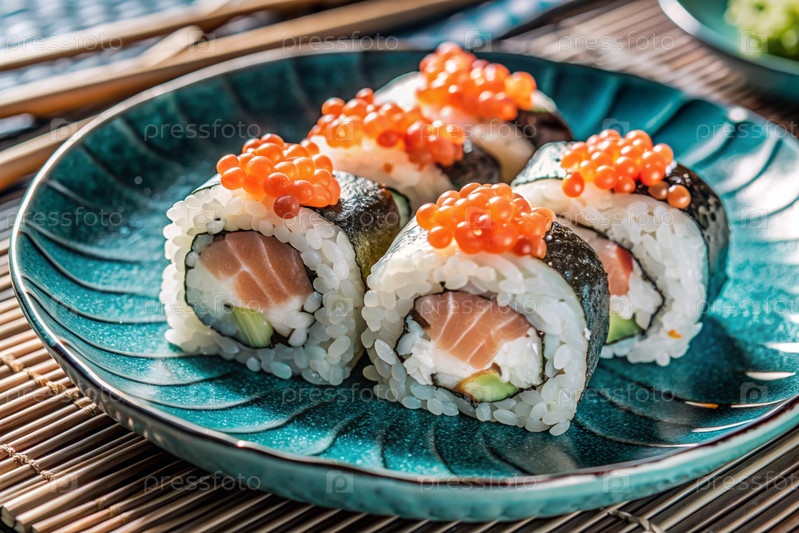 Японская еда. Суши-роллы Калифорния, Филадельфия с угорьем, красной икры и лососем. Концепция меню суши-бара