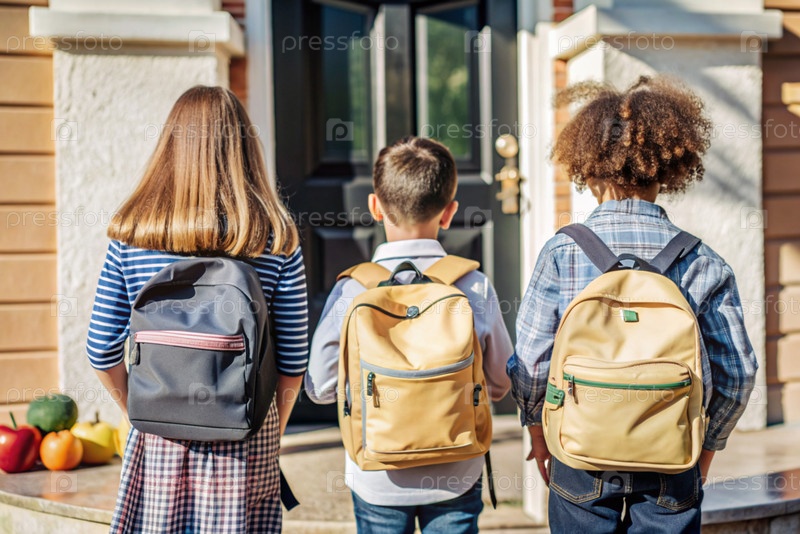 Праздник приходится на 1 сентября. Дети с желтыми рюкзаками бегут в школу. Обратный взгляд. Давайте вернемся в школу. Концепция нового учебного года в школе. Осенний день знаний