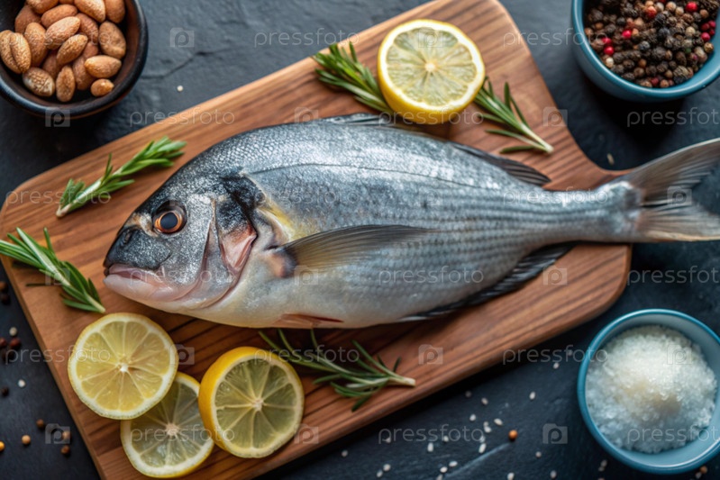 Вкусная и здоровая рыба. сырой дорадо с лимоном и ингредиентами на темном фоне. баннер, меню, место для текста рецепта, верхний вид