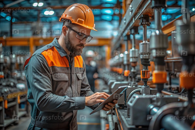 Профессиональный инженер, рабочий, техник в шлеме проверяет и работает на машине на заводе по производству запчастей