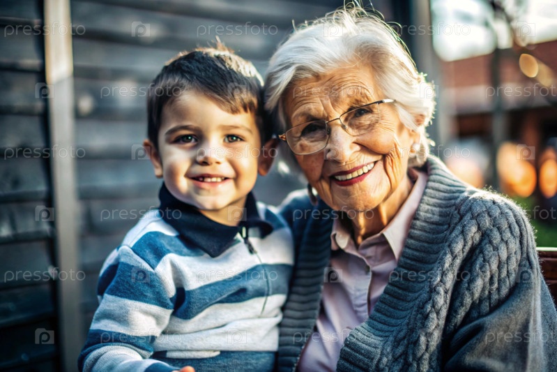 Счастливая семья, ребенок и бабушка обнимаются на улице в парке, счастливы и довольны