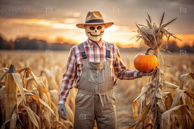 Концепция Хэллоуина. Ужасная. Страх. Устрашающий богий с тыквенной головой, квадратной рубашкой и бабочкой. Баннер, открытка