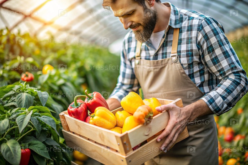 Сельскохозяйственная промышленность. деревянный ящик с перцем в руках фермера. садовник собирает богатый урожай в теплице