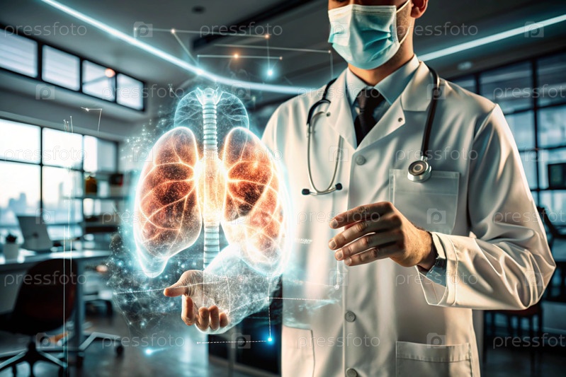 Врач в белом пальто демонстрирует голографическую модель человеческого легкого.Развитие медицинских технологий с использованием искусственного интеллекта