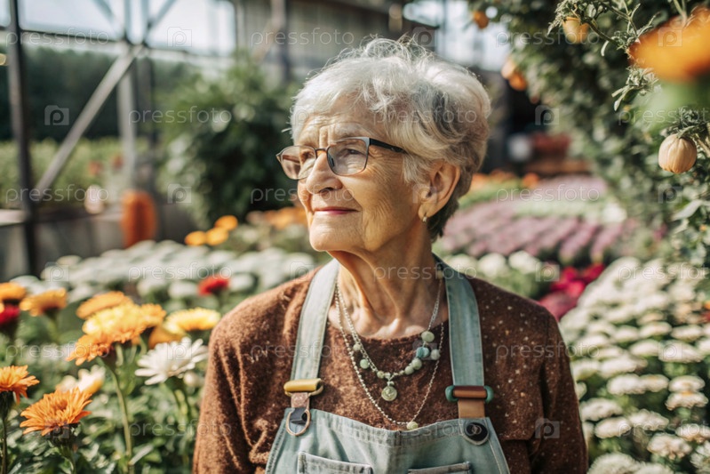 Пожилой садовник с седыми волосами в комбинезоне в уютной цветочной теплице