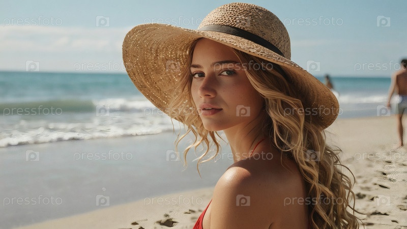 Женщина на отдыхе, сидящая в купальнике и соломенной шляпе с широкими краями на пляже в солнечный день и смотрящая на море