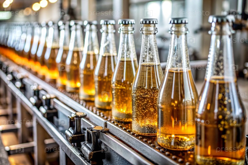 Пищевая промышленность. конвейер. линия розлива соды в стеклянных бутылках на заводе. вид на бутылку сладкого напитка с газом