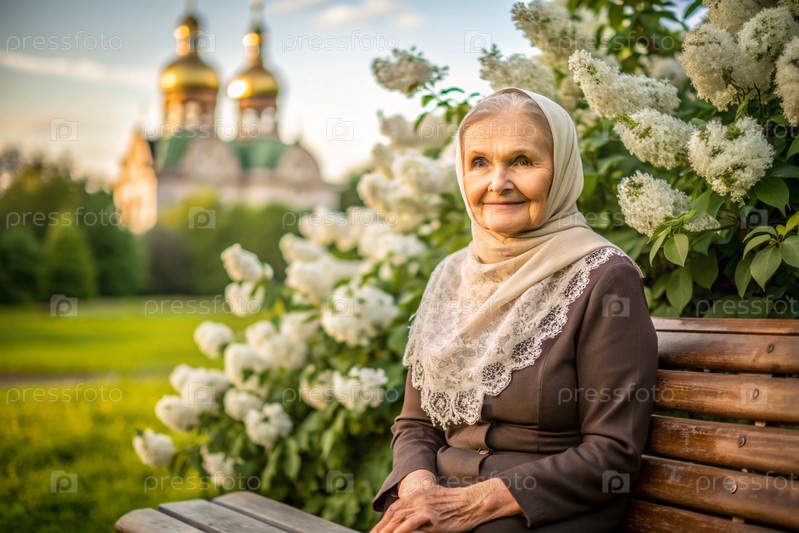Пожилая бабушка в плато сидит на скамейке рядом с цветущим деревом перед православным храмом